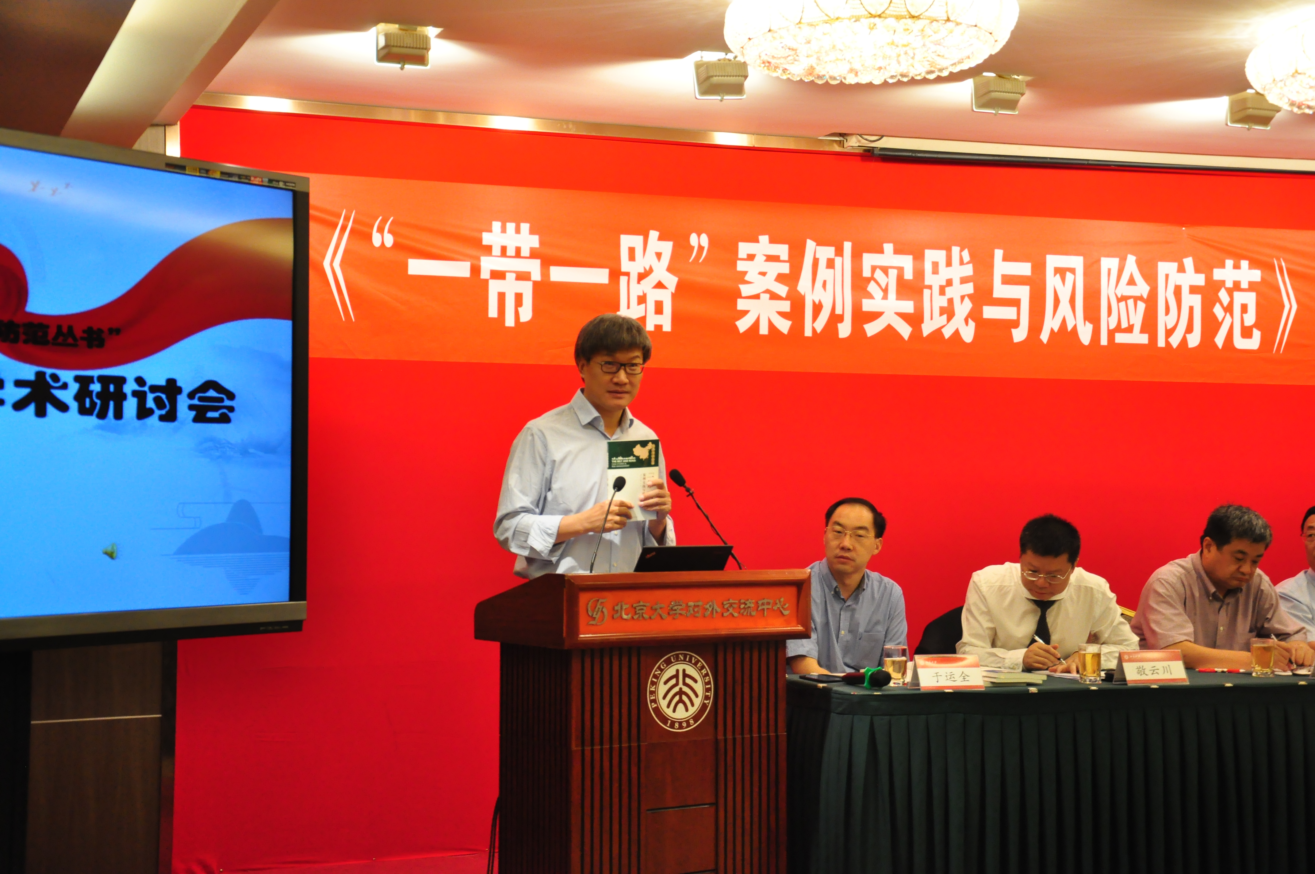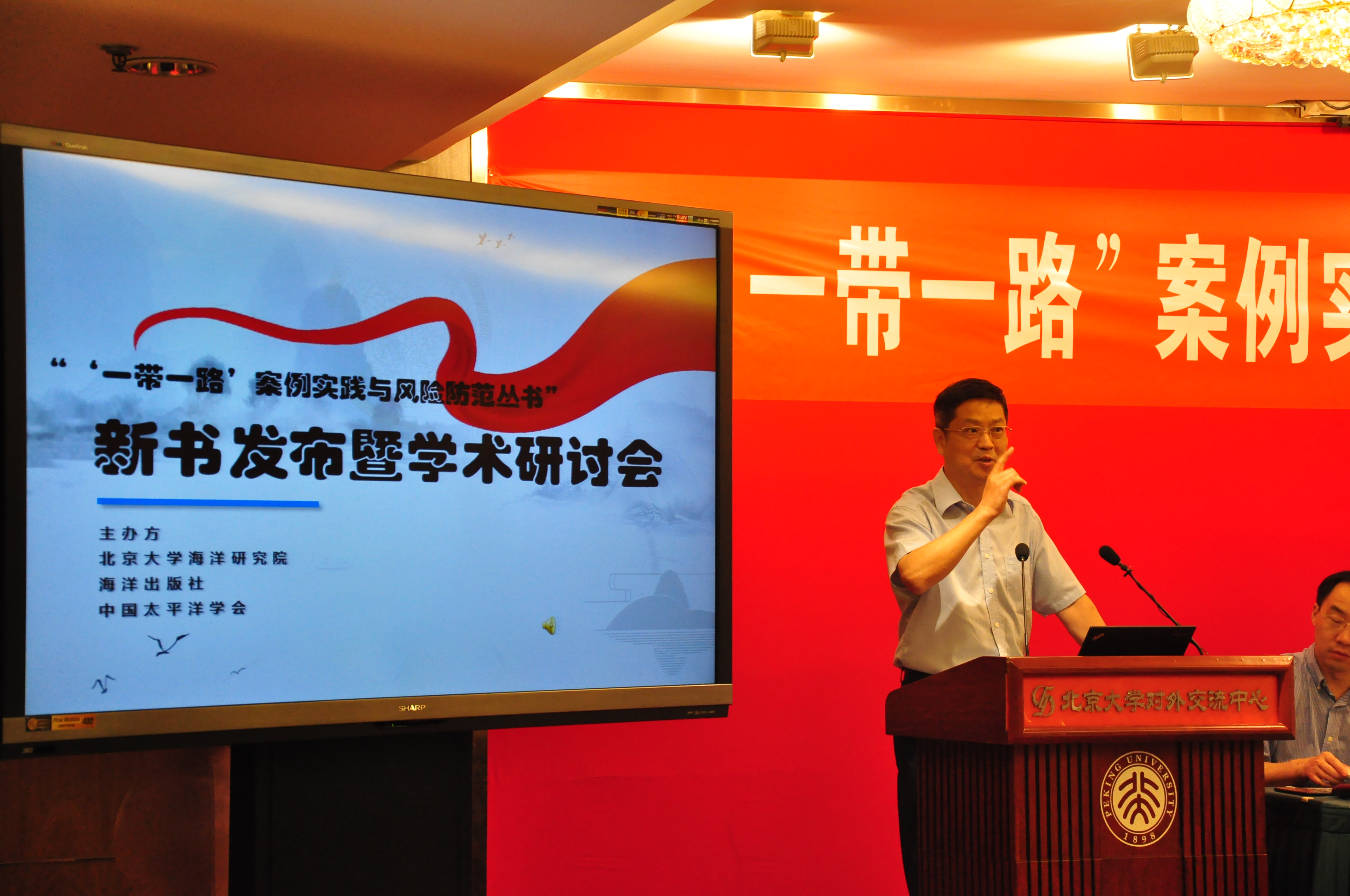 2017年5月21日,由北京大学海洋研究院、海洋出版社、中国太平洋学会共同主办的《“一带一路”案例实践与风险防范丛书》新书发布暨学术研讨会在北京大学英杰交流中心举行。北京大学校长助理王博、国家海洋局办公室副主任陈华明、海洋出版社社长杨绥华、北京大学海洋研究院副院长王磊、北京大学社科部副部长王周谊等出席。来自北京大学、国家海洋局、中国外文局、中国现代国际关系研究院、中国国际问题研究院、中关村管委会、环境保护部对外合作中心、国家发改委国际合作中心、中国石化国际石油工程公司等50余家机构的作者代表、专家学者、企业高管、律所合伙人、境外风险评估公司及智库研究员等120余位社会各界人士参会,共同见证《“一带一路”案例实践与风险防范丛书》新书的发布,并对“一带一路”的经济、政治、文化、法律四个相关话题进行了热烈的讨论。