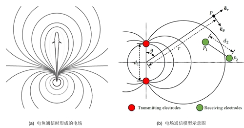 谢广明教授及合作者经过研究发现,自然界有些鱼类如南美电鳗亚目(Gymnotiformes) 鱼和非洲管嘴鱼科(Mormyridae) 鱼,可以主动发射和感知电场实现水下通信。其工作原理为电鱼通过自身特有的发电器官发射电场信号并且释放到周围水域,由于水是良导体,该电场信号会以类电偶极子场的方式进行传播,附近的其他电鱼可以感知第一条电鱼发射的电场信号,并从中提取频率、波形及信号时间间隔等有效信息,从而解读出电场信号中蕴含的信息,实现个体间的水下通信。从电鱼通信中得到启发,研究团队首先把电鱼通信系统抽象建模为由一对发射电偶极子和一对接收电偶极子组成的简化系统,接着对该电场系统进行数值仿真,初步掌握了其传播及分布特性,最后设计开发出了一套新型的仿生电场通信系统。研究团队对该仿生电场系统进行了深入系统地实验研究,分别对比了电场通信在静水、水流流动、有障碍物环境和自然水域中的通信性能,结果表明水中电场通信比水声通信更为稳定,水体运动、障碍物及水质等复杂环境对电场通信影响都很小。目前发射功率仅为0.25W时即可实现水下3~5米的近距离电场通信,增加发射功率和电极间距可进一步提高通信距离,未来具有较大应用前景。该成果以长文 (Regular Paper) 的形式发表于Bioinspiration & Biomimetics (W. Wang, J. Liu, G. Xie, L. Wen, and J. Zhang, “A Bio-inspired Electrocommunication System for Small Underwater Robots”, Bioinspiration & Biomimetics, 12, 036002, 2017.)。