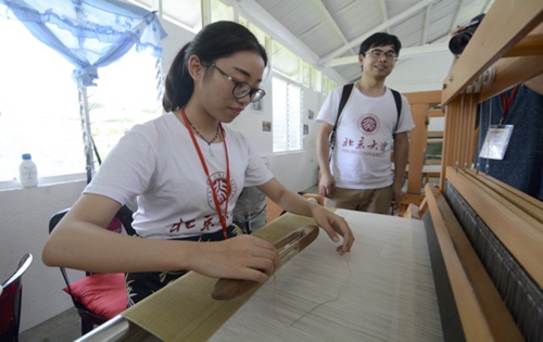 服务团成员陈楚珂、左金彪体验GK Enchanted Farm纺织过程