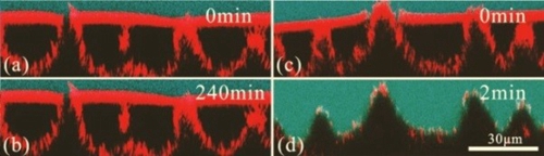 (a)(b)显示在1.5个大气压下,饱和的水中,荷叶表面气层可以长时间稳定存在;(c)(d)表示在不饱和的水中,气层很快会消失