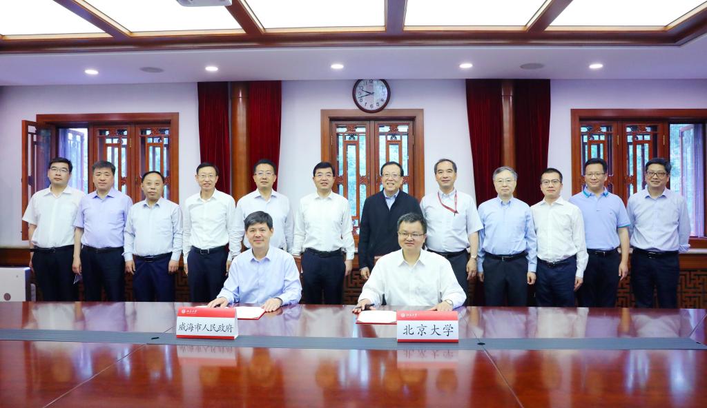 张平文与威海市副市长张伟共同签署《威海市人民政府 北京大学 共建北京大学威海海洋研究院合作协议》,出席活动的相关领导和职能部门负责同志见证协议签署。