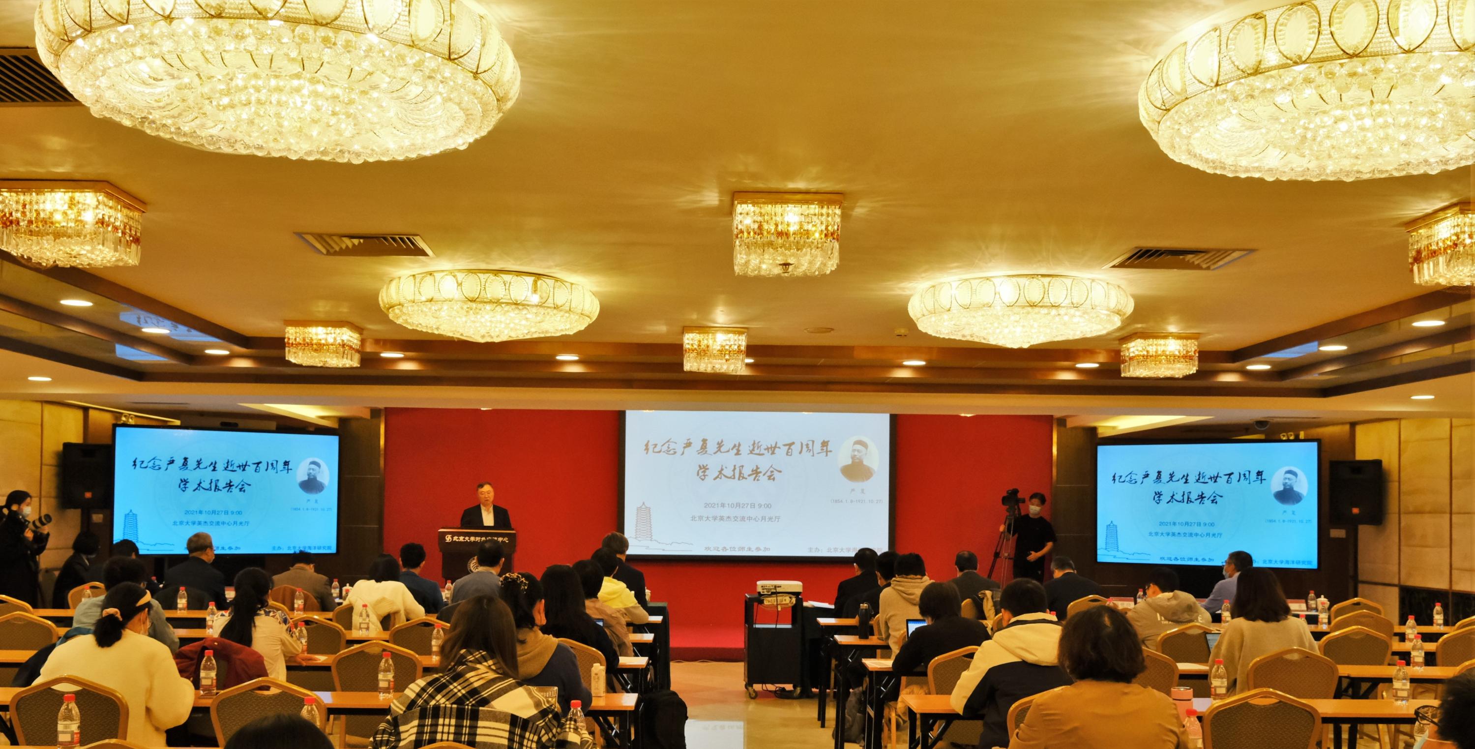 2021年10月27日上午,“纪念严复先生逝世百周年学术报告会”在北京大学英杰交流中心月光厅举行。会议围绕中国近代史上启蒙思想家、翻译家、教育家严复先生的生平和思想等诸方面,邀请在京专家学者作学术报告。北京大学校长郝平、副校长王博等出席会议。会议由北京大学海洋研究院主办。海洋研究院院长周力平主持会议。