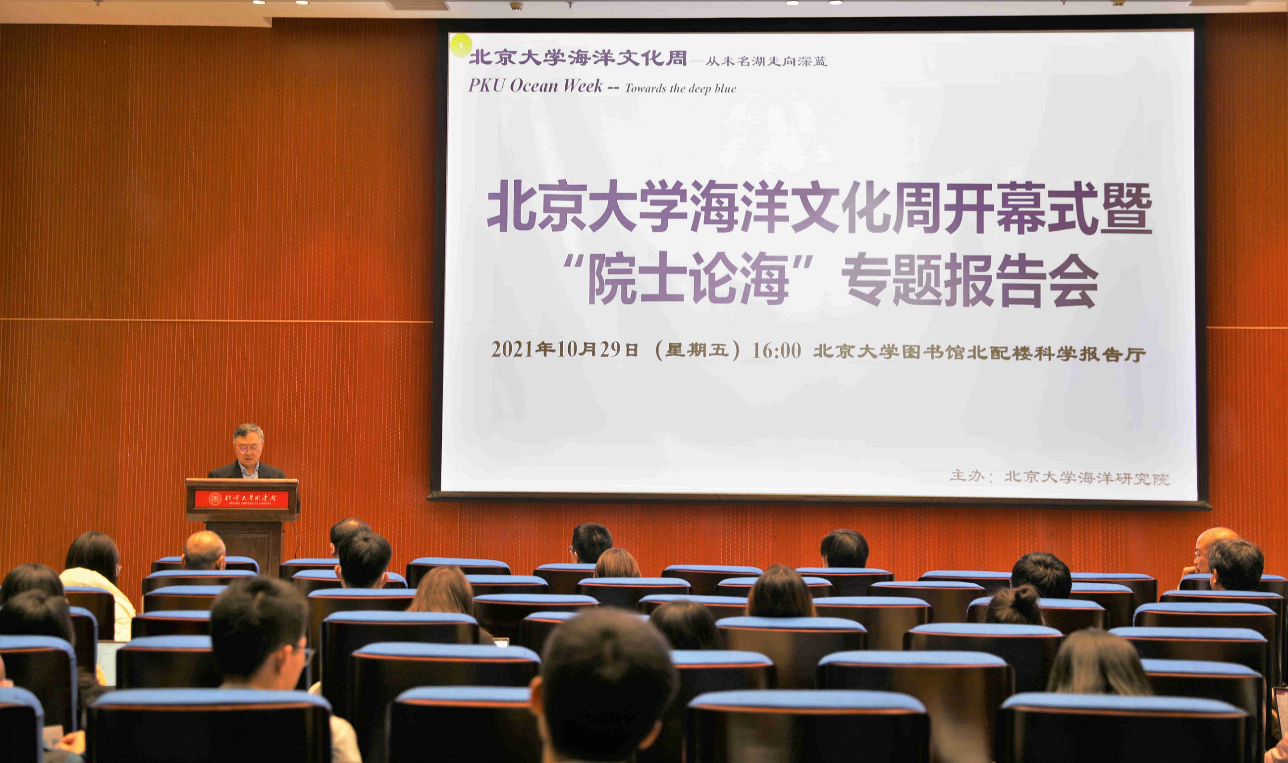 10月29日下午,北大海洋文化周开幕式暨“院士论海”专题报告会在图书馆科学报告厅举行。北京大学常务副校长龚旗煌院士出席并致辞,中国科学院院士陈大可、戴民汉分别作“粤港澳大湾区海洋监测与预报系统”、“关于碳中和、碳循环与海洋碳汇”学术报告,并为北大师生现场解疑答惑。