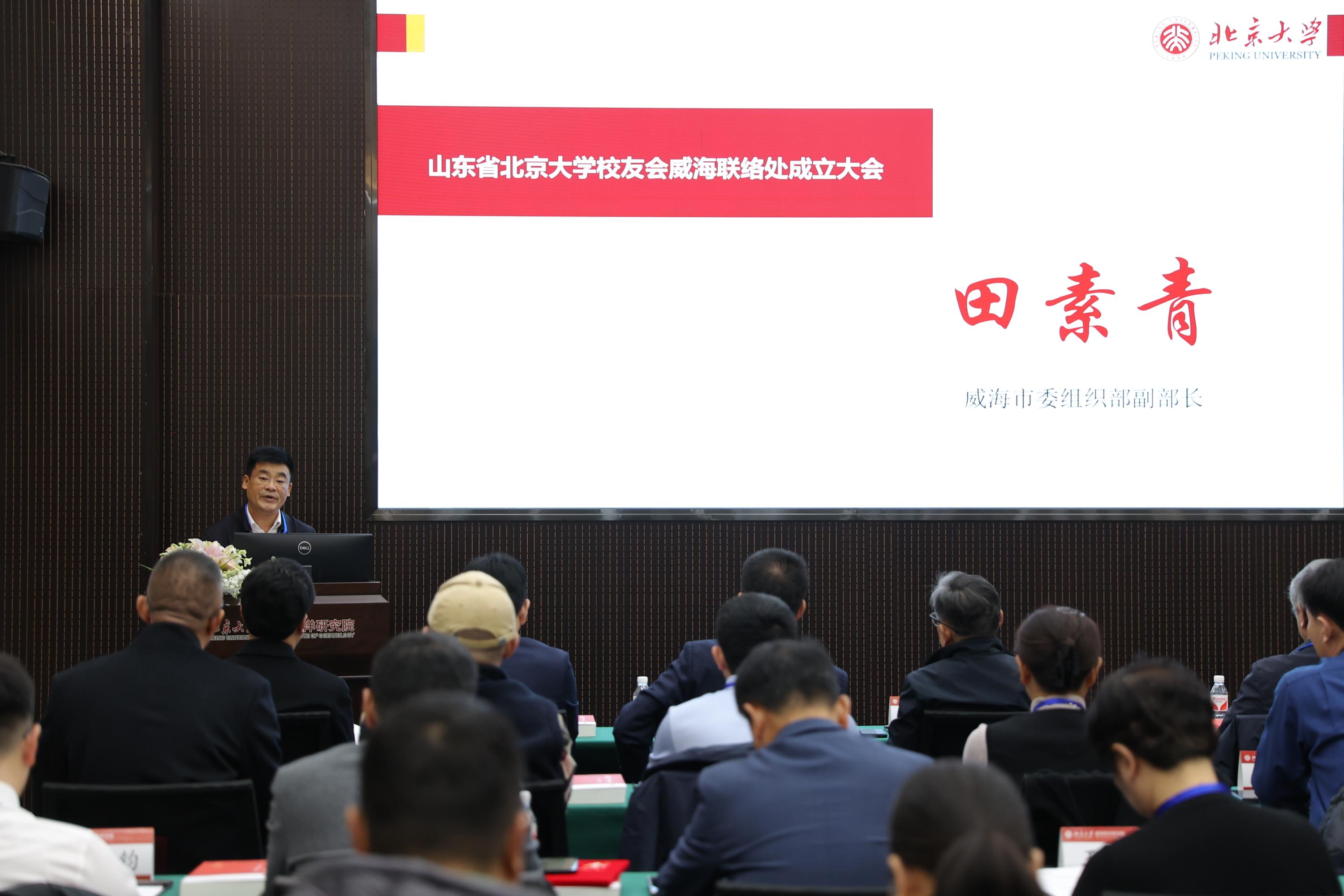 威海市委组织部副部长田素青代表威海市委人才工作领导小组办公室和威海市委组织部对山东省北京大学校友会威海校友联络处的成立表示祝贺。他指出,深化校地合作、实现共赢发展,是贯彻落实党的二十届三中全会精神、加快教育科技人才一体化的重要路径。相信在校地双方的通力协作下,在威海校友联络处的沟通协调下,在各位校友的共同努力下,一定能够集聚北京大学各方面资源优势,为威海各项事业发展注入更多、更强劲的动能。威海也将以最开放的胸襟、最优越的环境、最暖心的服务,为广大校友成就事业、实现梦想搭建广阔舞台。