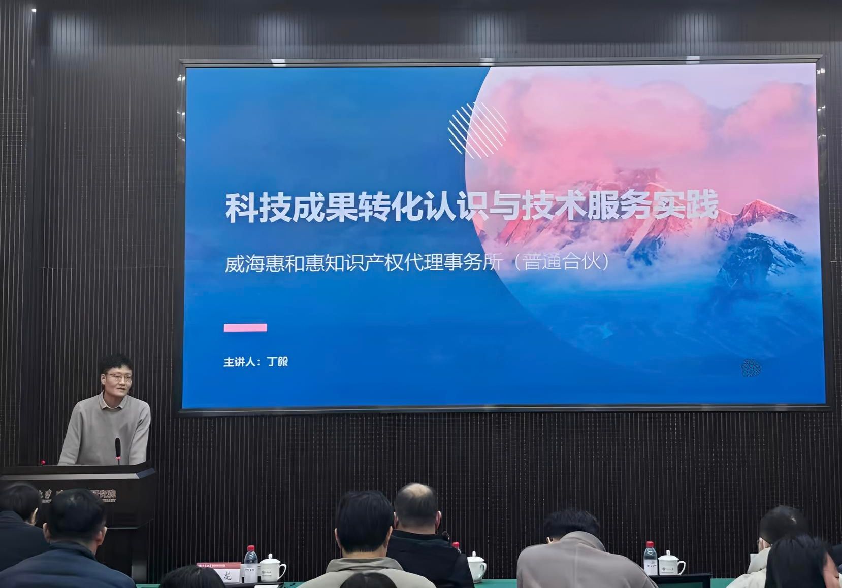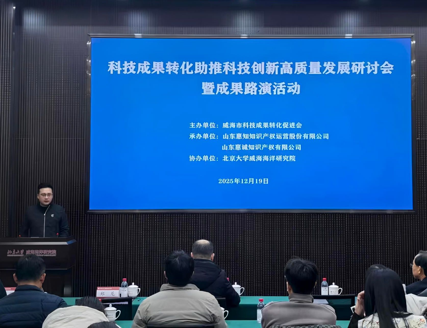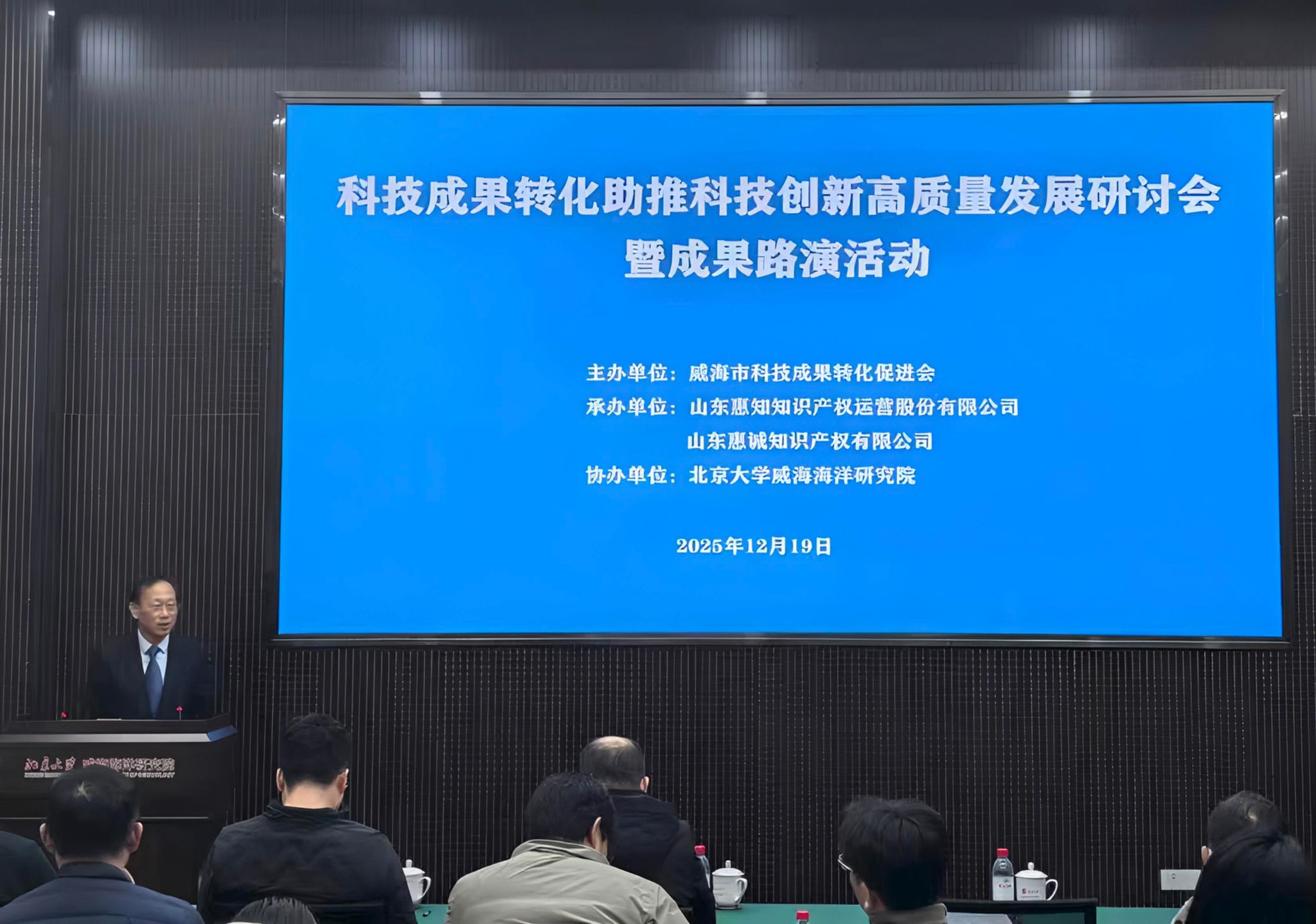 12月19日下午,由威海市科技成果转化促进会主办,北京大学威海海洋研究院协办的 “科技成果转化助推科技创新高质量发展研讨会” 在研究院黄海厅顺利举办。本次研讨会聚焦科技成果转化全链条痛点与解决方案,汇聚高校科研院所、企业、知识产权及法律服务机构等多方力量,通过主题分享、成果路演等形式搭建产学研用对接平台,为区域科技创新高质量发展注入新动能。