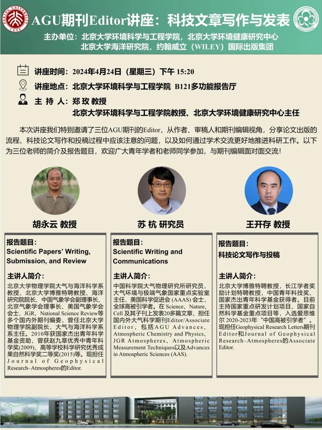 本次讲座我们特别邀请了三位AGU期刊的Editor,从作者、审稿人和期刊编辑视角,分享论文出版的流程、科技论文写作和投稿过程中应该注意的问题,以及如何通过学术交流更好地推进科研工作。以下为三位老师的简介及报告题目,欢迎广大青年学者和老师同学参加,与期刊编辑面对面交流!