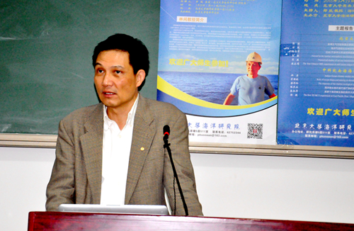 2016年3月28日,应北京大学海洋研究院的邀请,中国科学院南海海洋研究所副所长、特聘研究员林间及南海所十二位教授、研究员访问北京大学。晚上7点,北京大学理科教学楼103教室座无虚席,林间教授为大家带来题为《深海前沿科学技术在“一带一路”战略中的发展机遇》的精彩讲座。讲座由北大环境科学与工程学院教授、海洋研究院副院长郑玫主持,海洋研究院院长、工学院院长张东晓,地空学院教授、海洋研究院教授陈永顺专门前来聆听讲座。讲座包括深海发展的国家战略需求、前沿科学、总体战略思路以及未来展望四个部分,林间教授以通俗易懂的图文对照、耐人寻味的海上经历,对当前国际深海领域最尖端的前沿技术作了精彩介绍,现场师生纷纷表示深受启发。