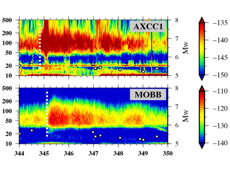 Plots of power spectral density (a measure of how much energy is present at different frequencies) at ocean bottom seismometers AXCC1 (top panel), located offshore Cascadia, and MOBB (bottom panel), located in Monterey Bay, California. The x axis represents time, labeled as days of the year 2015, while the y axis represents wave periods, in seconds (labeled at left). Colors indicate the power spectral density in decibels (dB), with red colors indicating more energy and blue colors indicating less energy. The dashed white line indicates the first appearance of strong energy at relatively long periods due to a storm impacting the Cascadia region of the west coast of the United States. Small gray dots indicate the timing of relatively large earthquakes globally, with the size of the earthquakes (on the moment magnitude scale, Mw) shown on the right side of the plot. Credit: Maurya et al. [2019], Figure 5 lower right panels