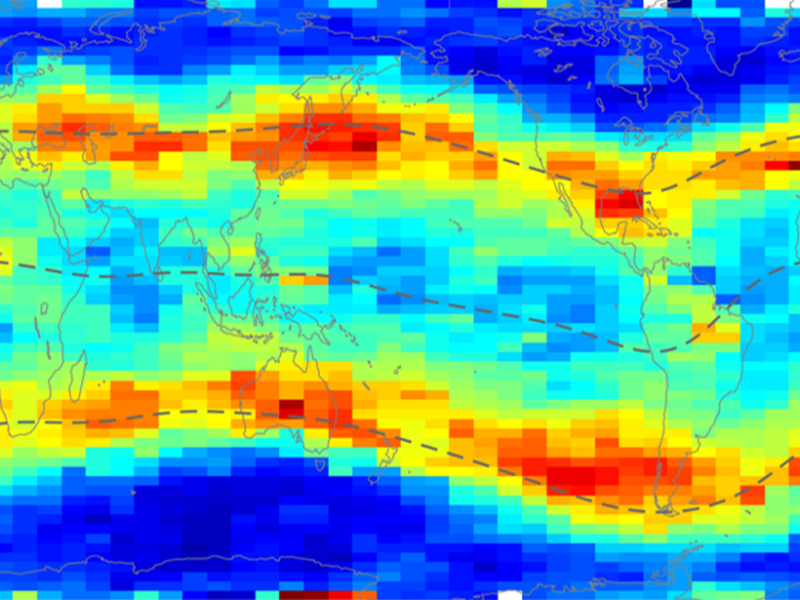 Measurements from the COSMIC (Constellation Observing System for Meteorology, Ionosphere, and Climate) satellite of electron density at an altitude of 800 kilometers at 3 a.m. local time. The satellite orbital period is approximately 90 minutes, so, over the course of many orbits, all longitudes are sampled as the Earth rotates. The data was filtered for times near the March equinox during low magnetic activity times. It clearly shows the off-equatorial density peaks at ± 40 degrees magnetic latitude. Credit: Lei et al. [2019], Figure 1a