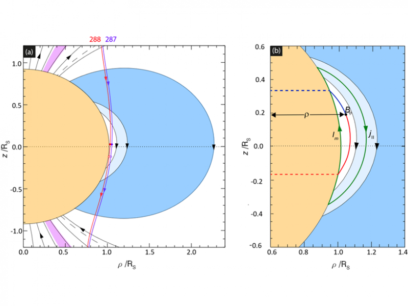 The left panel shows two Cassini spacecraft “Grand Finale” orbit trajectories cutting between the planet’s upper atmosphere (light orange region) and the ring regions (blue shaded regions, and their magnetic mapping to the planet). The right panel is a close-up of the space inside of the D ring, with arrows showing the newly identified current system flow. Credit: Hunt et al. [2019], Figure 1