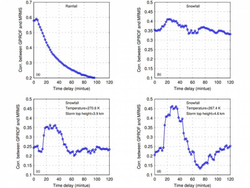 The correlation between satellite retrievals (GPROF) and ground-based (MRMS) observations of precipitation is highest for very short lead times in the case of rainfall (top left), where it decreases sharply with time, while the correlation stays high for longer in the case of snowfall (top right). Credit: You et al. [2019], Figure 3