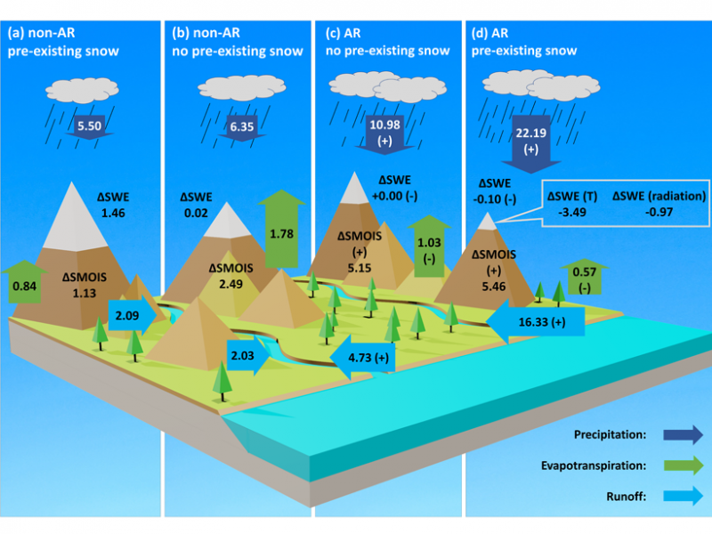 Co-occurrence of atmospheric rivers (ARs) and pre-existing snowpack significantly enhances runoff in western United States watersheds. The average response of surface water budgets is classified into four categories depending on whether precipitation is associated with ARs and whether there is pre-existing snowpack on the ground. Credit: Chen et al. [2019], Figure 10