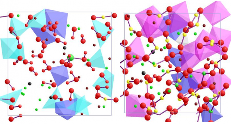 Calculated structure of hydrous eutectic silicate melts at 4000 K and at pressures of 9.4 GPa (left) and at 146.1 GPa (right). The coordination polyhedra of Si-O evolve from four-fold (cyan) and five-fold (blue) to more six-fold (magenta) as pressure increases. The speciation of water in the melt evolves from having more hydroxyls (red-red sphere pairs) and molecular water (red-red-red sphere triplets) to having more bridging hydrogen bonds (red-yellow-red sphere triplets) with pressure. Based on the structure at conditions of the core-mantle boundary (right), hydrous partial melts are denser than coexisting solids when melt fractions are less than about 15%. Credit:Du et al. [2019], Figure S1 (left and right panels)