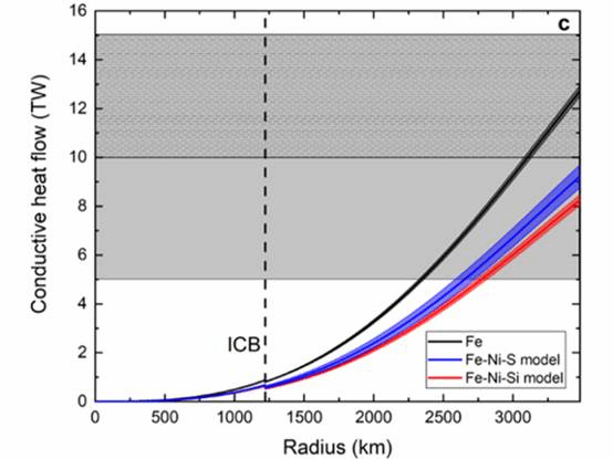 A graph showing total conductive heat flow in the core as a function of radius for pure iron (black line) and compositional models containing Fe-Ni-S (blue line) and Fe-Ni-Si (red line). Total conductive heat flow in the core as a function of radius for pure iron (black line) and compositional models containing Fe-Ni-S (blue line) and Fe-Ni-Si (red line). The inner core boundary (ICB) is shown by the vertical dashed line and values for the heat flow at the core-mantle boundary are represented along the right side of the diagram (radius, 3400 km). The grey shaded area shows the range of values from geophysical estimates (5-15 TW), with most recent values given by the grey and dash-shaded area (10-15 TW). The new values of 8-9 TW support thermal convection over compositional buoyancy as the primary source of energy powering the geodyamo. Credit: Yong et al. [2019], Figure 3c