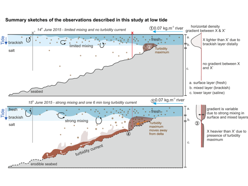 The standard theory for river-induced turbidity currents is that a large sediment input from the river is required. Hage et al. [2019] turn that theory on its head. They demonstrate that turbidity currents can, in fact, be generated from rivers with a very small sediment load. The case is made with an incredibly detailed set of measurements which catch a short (6 minute) turbidity current in the act of forming and dissipating – even showing the change in sea floor bathymetry after the event. These results will lead to a re-evaluation of how and when turbidity currents form.