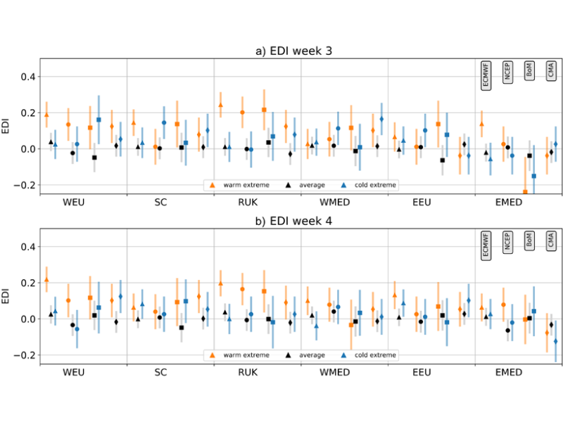 Wulff and Domeisen [2019] investigate the skill of S2S predictions over Europe from four leading centers worldwide. Intriguingly, they find that summer heat waves are more predictable over most regions of Europe compared to spells of normal or cold weather. In other words, heat waves such as those experienced this past summer could be better anticipated than typical average or cold climate events.