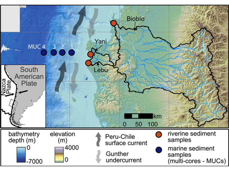 Sediment sampling sites along the Chilean coast showing the locations of marine surface sediment sampling (dark blue circles) and river sediment sampling (red circles). Moving offshore, the beryllium isotope ratio10Be/9Be of clay-sized sediments increase four-fold over terrestrial river catchments, reflecting the marine source of biogenic silica in authigenic clay formation. The beryllium isotope system is sensitive enough to detect as little as 2 percent or less fraction of marine clay minerals, which will improve the ability to track reverse-weathering reactions in the oceans. Credit: Bernhardt et al. [2020], Figure 1