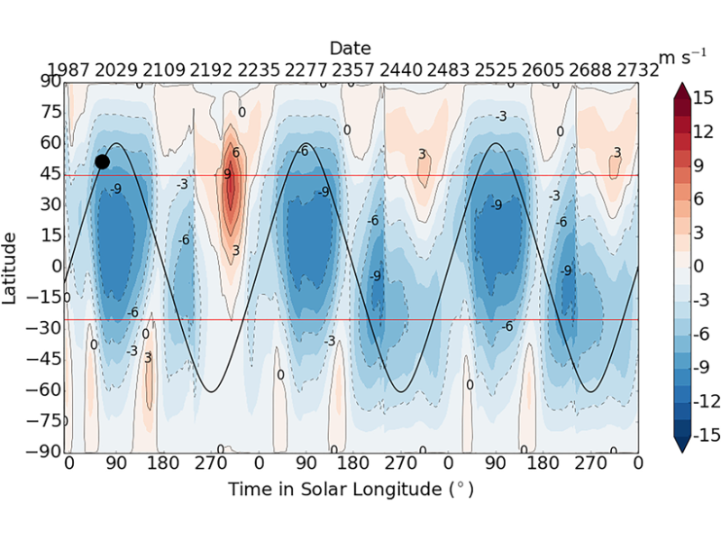 The figure shows the zonal winds in the upper atmosphere of Pluto as a function of season for three Pluto years. Color shading and black contours show the (zonal mean) zonal wind speed (m/s: positive values are westerlies; negative values are easterlies). The dominating blue color reveals that a retro-rotating atmosphere prevails practically throughout Pluto's year. The black solid line indicates the latitude of the subsolar point and its position during the New Horizons encounter is shown by the black circle. Credit: Bertrand et al. [2020], Figure 9