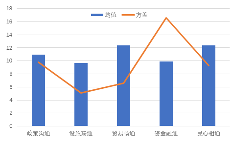 First, the levels of development in various "Connectivity" are quite different, and the differences of various nations are more conspicuous. In terms of level of overall development, the scores of impeded trade and people-to-people bond are relatively, reaching 12.36 and 12.34 respectively, while the scores of the other three indexes are all below 10. This shows that there are huge differences in the Five Connectivity areas. In terms of national dispersion degrees, the nations differs most significantly in the level of capital integration with the variance at 16.62, which shows that the nations differs greatly in the level of connectivity in financial areas. The dispersion degrees in the areas of policy coordination and people-to-people bond are at a medium level with the variance at nearly 10. And the dispersion degrees in the areas of impeded trade and facilities connectivity are relatively low. From this we can see that the differentiation in development of the B&R construction is becoming more and more conspicuous in terms of both the Five Connectivity areas and nations.