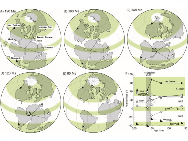 Paleogeographic reconstructions at different points in geologic history with regions of interest shown. The “monster shift” occurred between 160 and 148 million years ago (panels a to e). Paleolatitude as a function of time for the regions of interest with arid and humid climate belts indicated (panel f). Credit: Muttoni and Kent [2019], Figure 7
