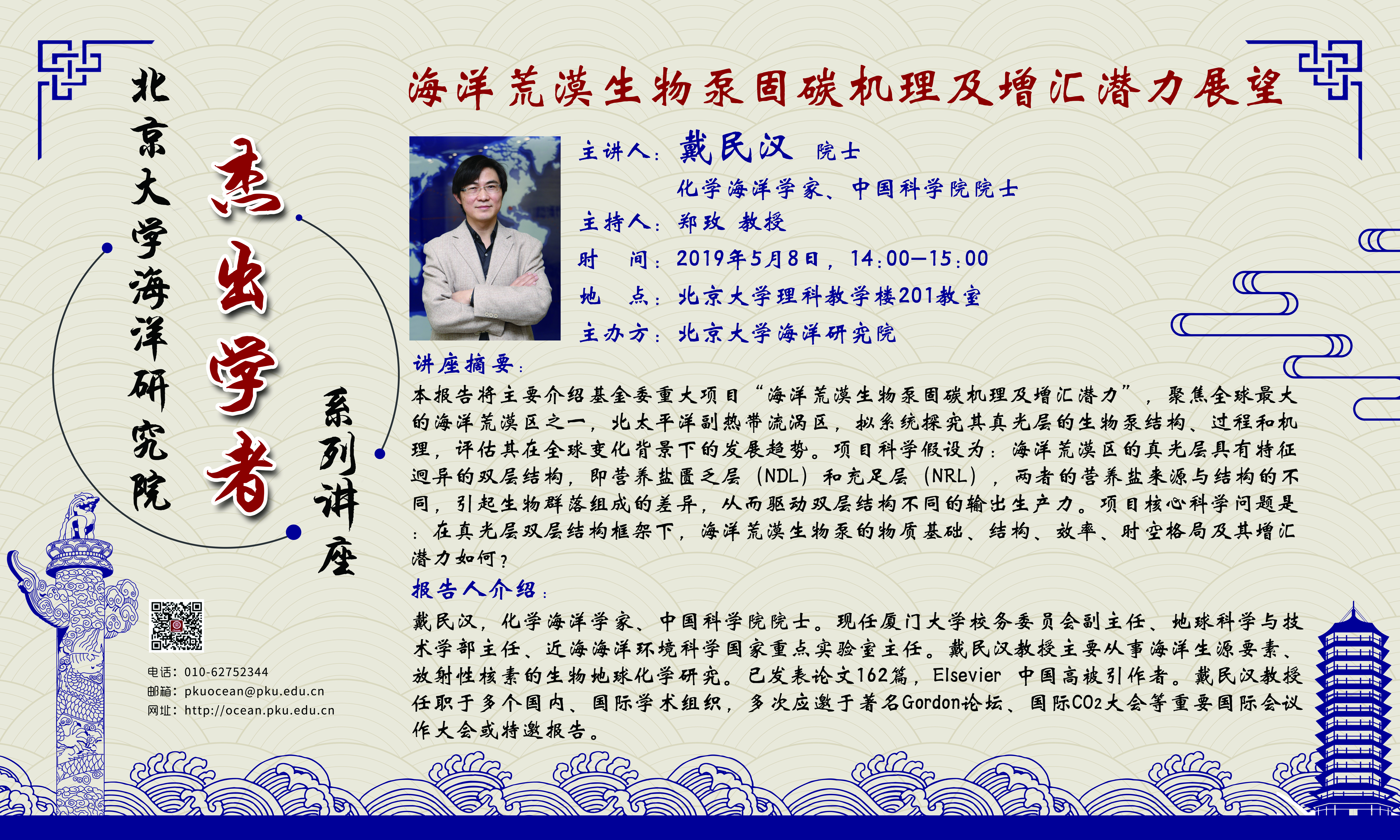 戴民汉 化学海洋学家、中国科学院院士。现任厦门大学校务委员会副主任、地球科学与技术学部主任、近海海洋环境科学国家重点实验室主任。戴民汉教授主要从事海洋生源要素、放射性核素的生物地球化学研究。已发表论文162篇,Elsevier中国高被引作者。戴民汉教授任职于多个国内、国际学术组织,多次应邀于著名Gordon论坛、国际CO2大会等重要国际会议作大会或特邀报告。